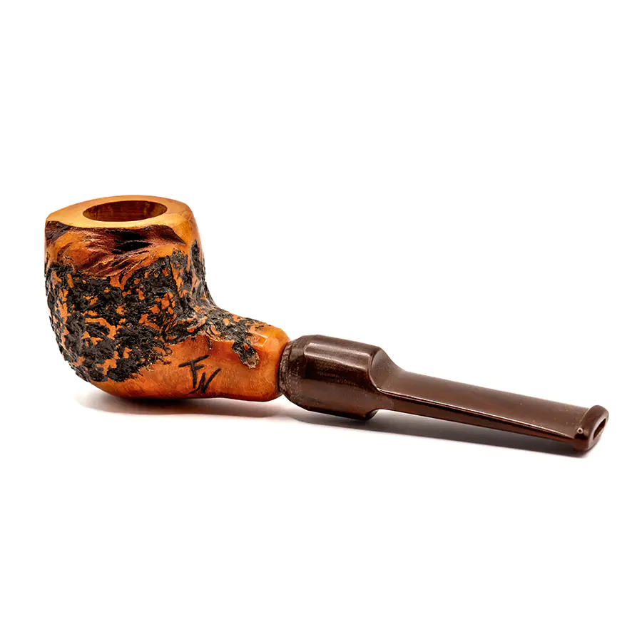 Un dettaglio distintivo di questo modello è il lato rusticato a mano, che aggiunge una texture unica e palpabile, e la scagliatura naturale sul lato superiore, che rivela la pura essenza del legno, celebrando le imperfezioni che rendono ogni pipa veramente unica.